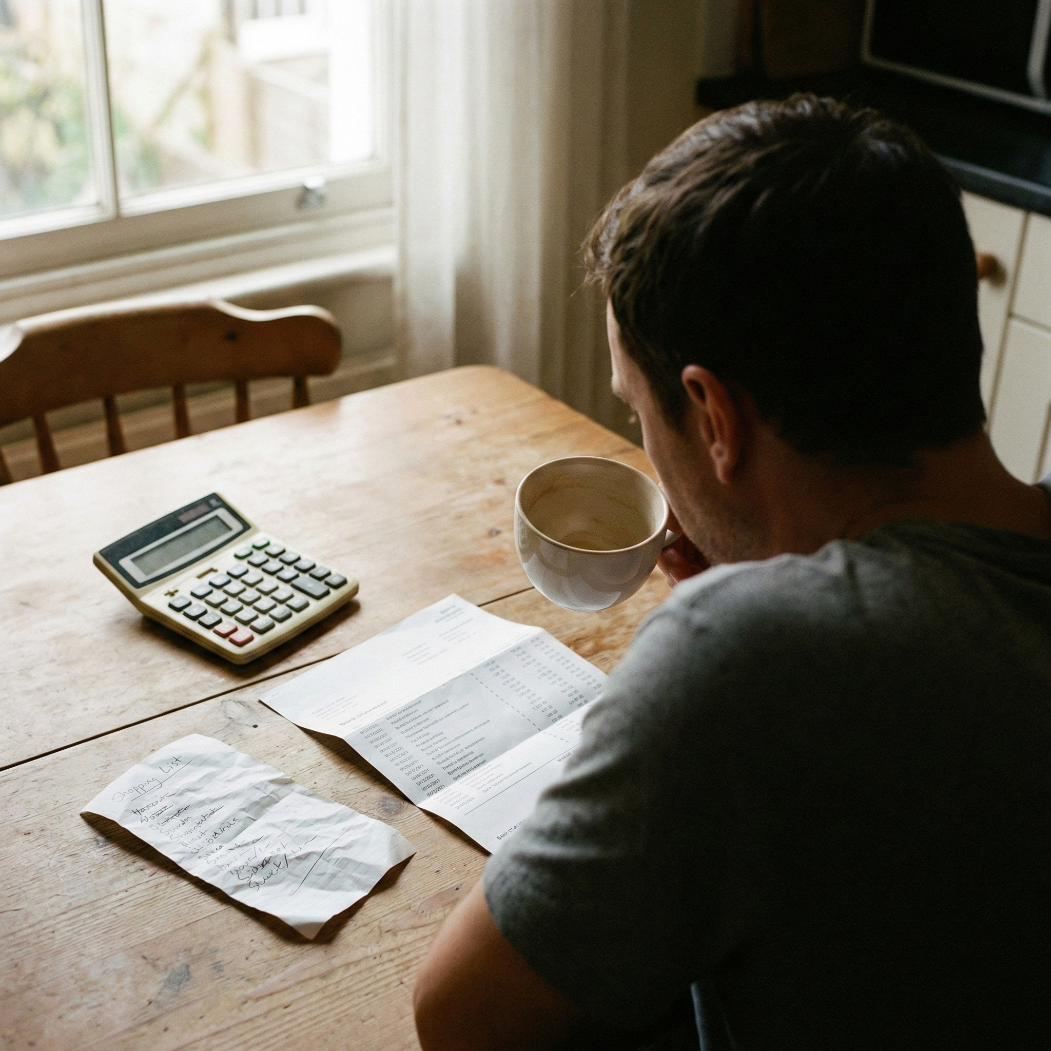Hero-Bildprompt: Hyperrealistische Editorial-Szene, Küchentisch mit Taschenrechner, Einkaufszettel ohne lesbaren Text, ein Kontoauszug als abstraktes Muster, Person schaut auf die leere Kaffeetasse, weiches Morgenlicht, spürbare Anspannung, keine Logos