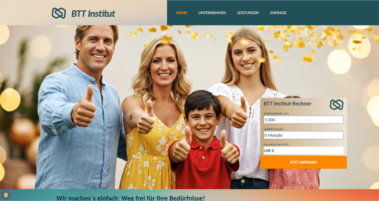 Eine tragfähige Finanzsanierung bedeutet, mit eigenen Mitteln wieder Kontrolle zu gewinnen – ohne neue Kreditlast als zusätzliche Baustelle. BTT Institut fokussiert sich auf Sanierungslösungen, die zu Ihrer Leistungsfähigkeit passen und Schritt für Schritt aus der Überschuldung führen. Wenn Sie eine professionelle Regulierung statt endloser Notlösungen anstreben, starten Sie mit einer fundierten Erstaufnahme Ihrer Situation.